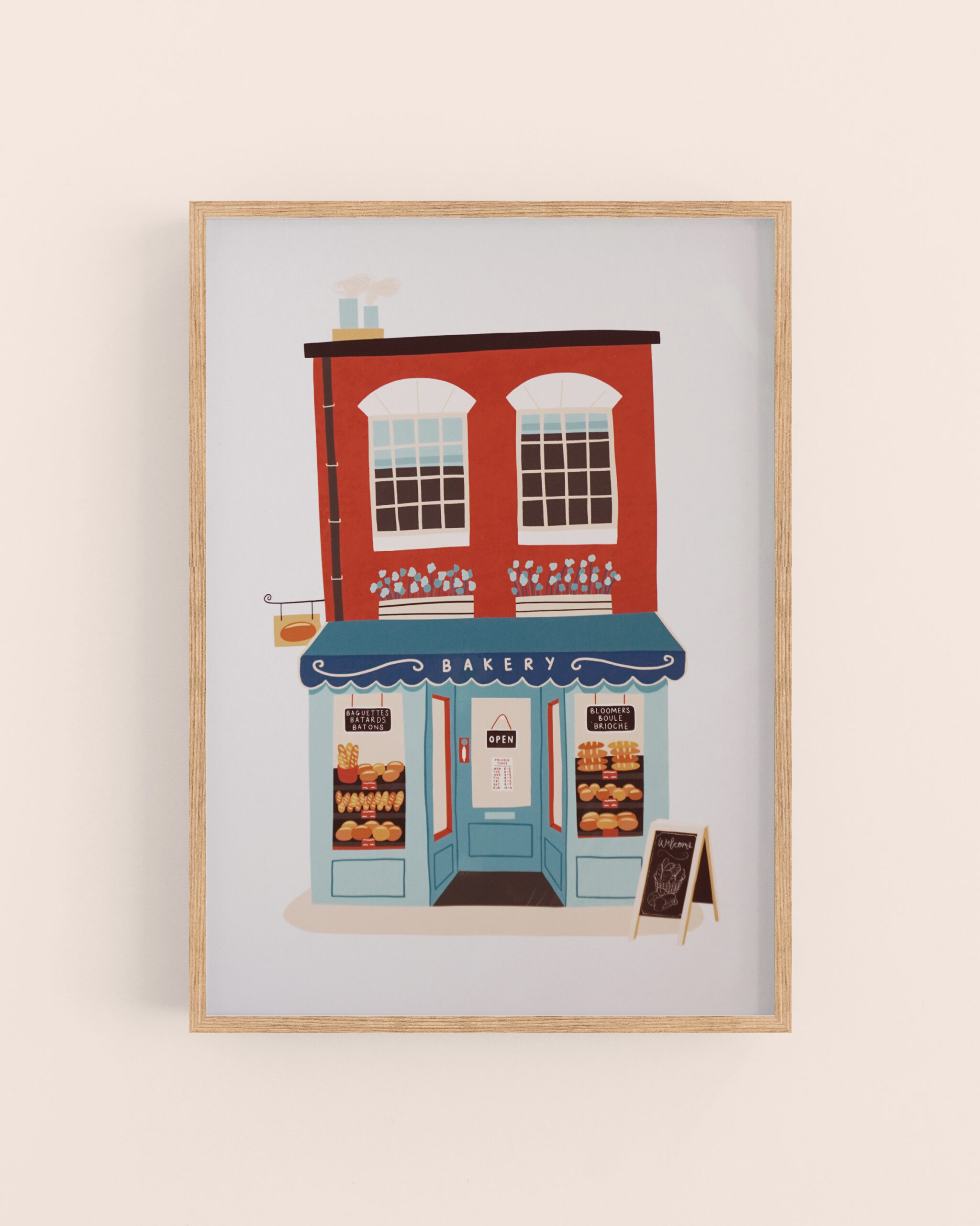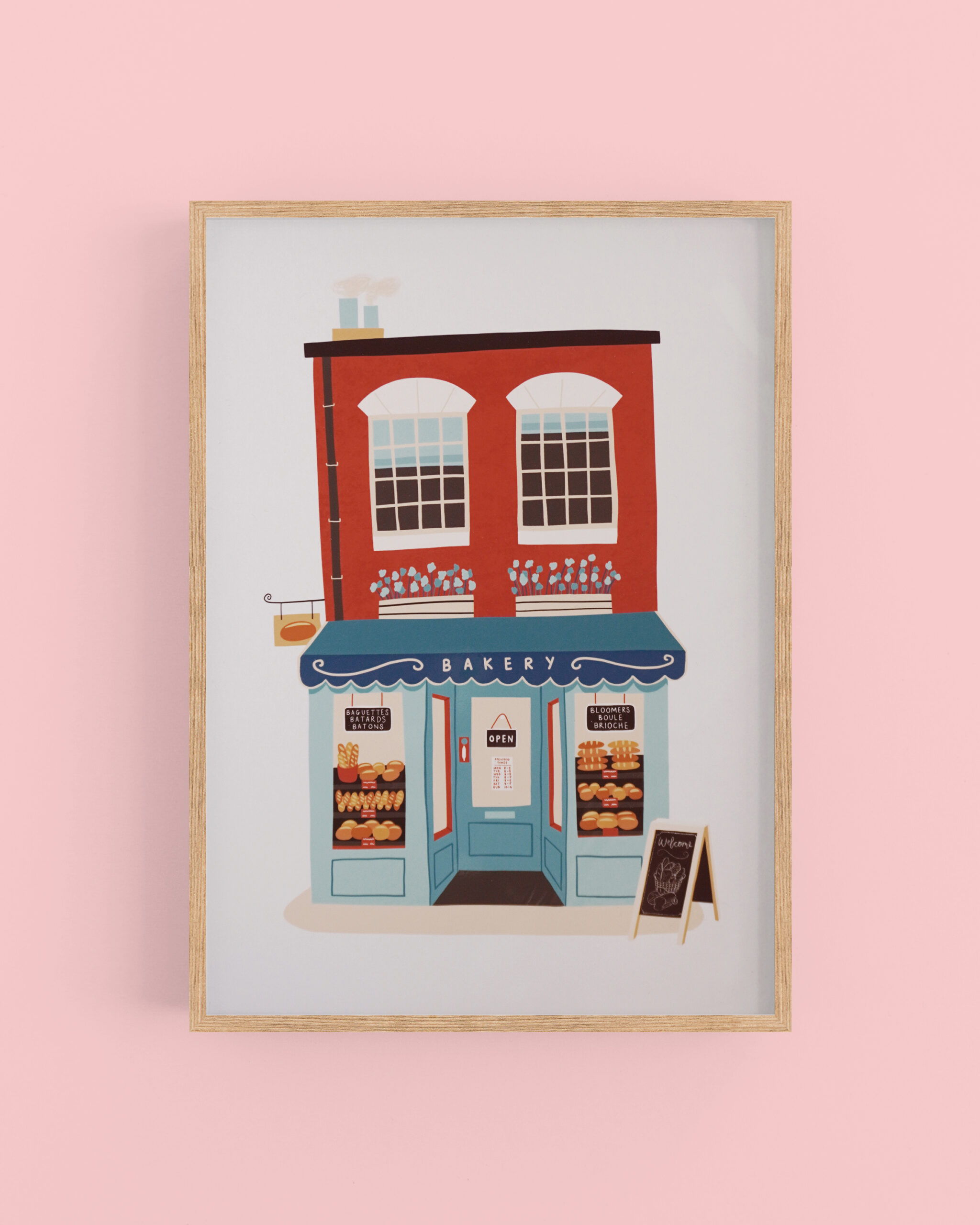 The perfect art print for yourself or a creative friend who loves baking or enjoying tasty artisan treats, with a digitally created bakery shop illustration by Emily Nelson.