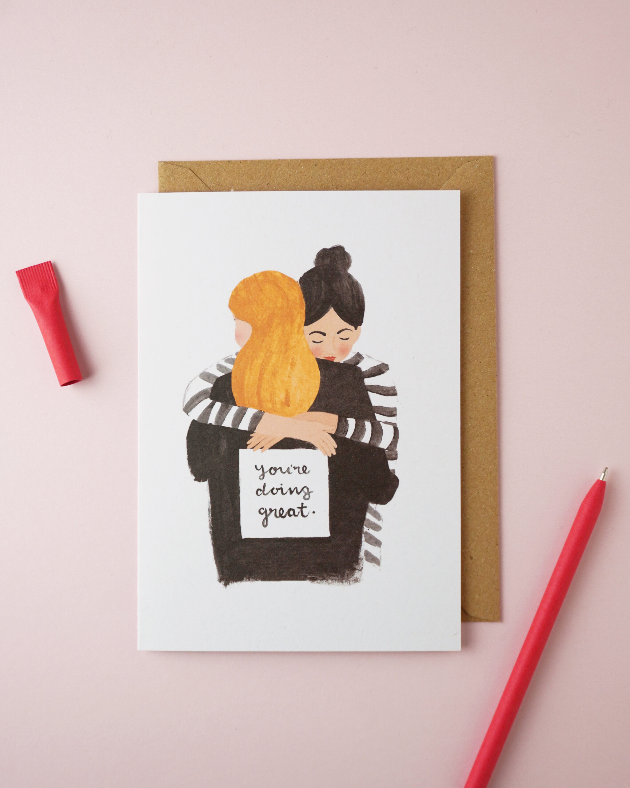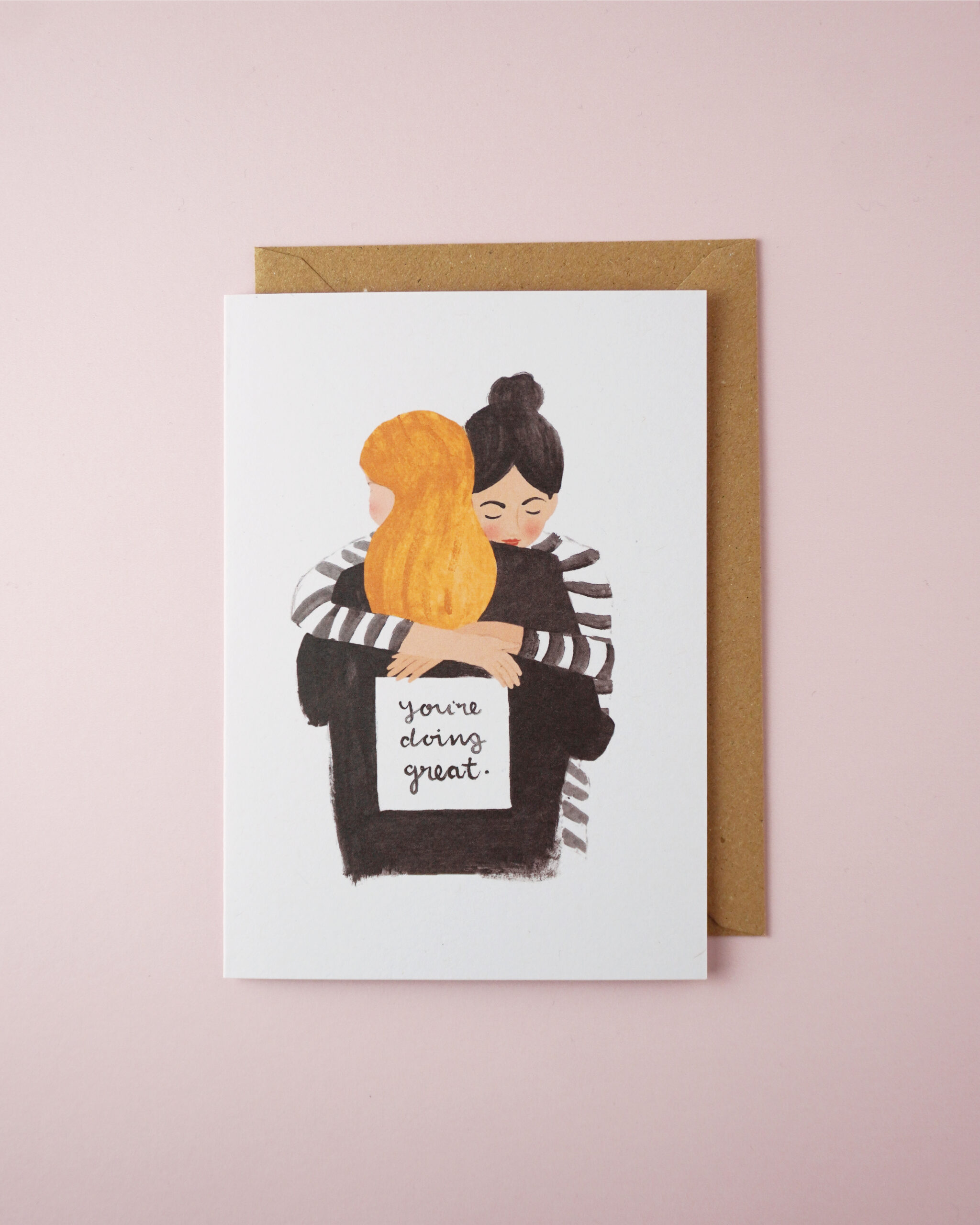 Jade Fisher – Jade is an illustrator based in Wales, UK. With the help of her childhood friend, Lauren, she creates playful cards, paper goods, and gifts that inspire kindness and connection. All of her cards are printed on recycled board. Her “you’re doing great” card is a great way to encourage a creative friend, let them know you’re thinking of them, or acknowledge their personal strength. See our full collection of Jade Fisher cards.